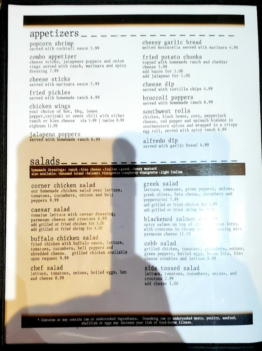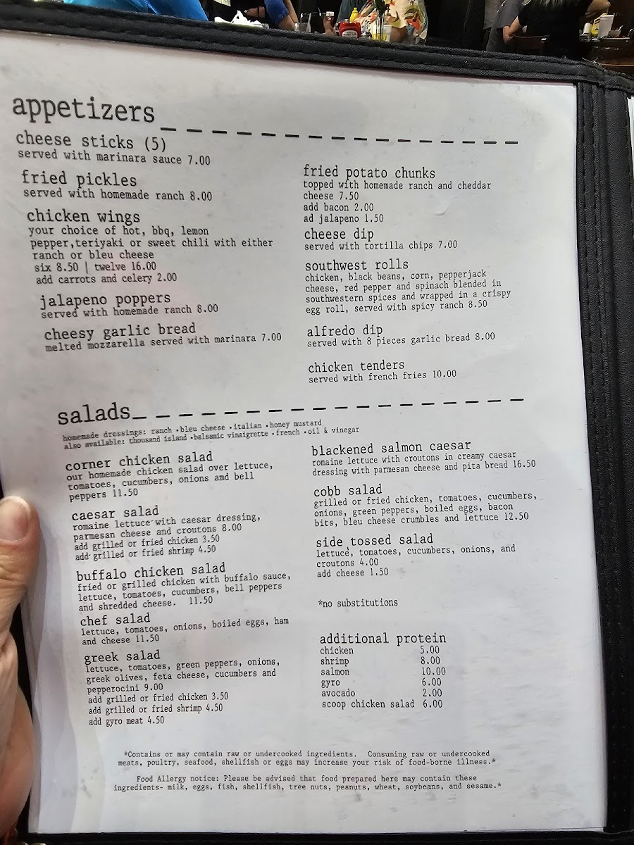 Wow! Great prices, wonderful and friendly staff and huge portions! I don't know how they do it but they do do it (lol) and do it well. Tonight's choice was a full rack of ribs, fries, a salad and Cole slaw. All for the amazing price of 16.50!! I've been in town for two nights and eaten at both Corner Cafe's. What a deal!